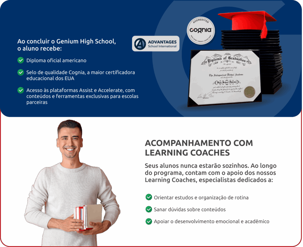 Leve o Genium High School para sua instituição e ofereça uma formação internacional, com apoio completo e resultados reais.